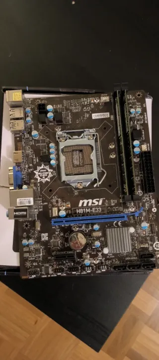 Placa base MSI H81M-E33, socket LGA 1150. Incluyo dos módulos de memoria RAM marca Kingston. Se vende como averiada porque está sin probar, por eso no se admiten devoluciones. Al puentear el arranque con una fuente de alimentación giraba el disipador y el ventilador de la fuente. Todos los pines están bien.