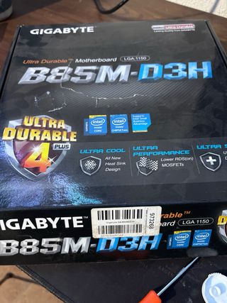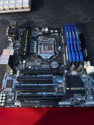 Placa base y módulos de memoria RAM. - Placa base Gigabyte con zócalo Socket 1150. - Incluye 4 módulos de memoria RAM HyperX 16 gb en total - Soporta CrossFire y UEFI DualBIOS. la placa funciona perfectamente pero tiene algun pin doblado del prosador , y el primer slot de grafica no funciona , pero el segundo si , de ahi su ridiculo precio