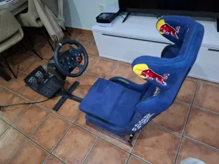 Asiento de simulación de carreras Playseat Redbull GRC con Logitech G29. Tiene un agujero que tapa el paso de cables por dentro. Negociable - Logos de Redbull y GRC. - Logitech G29 con pedales. - Soporte para palanca de cambios.