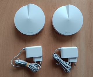 Sistema de red Wi-Fi en malla Deco M5 de TP-Link Version 3.2. Este pack incluye dos unidades para una cobertura ampliada. No dispongo de la caja original - Dos unidades Deco M5. - Adaptadores de corriente incluidos. - Cable Ethernet incluido. Wifi, internet, network, red, extensor, mesh, deco, plc, tp link, malla, amplificador, intranet