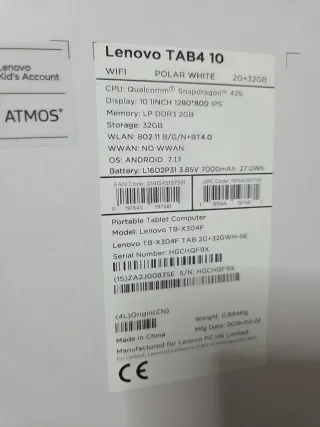 Tablet Lenovo TAB4 10 WiFi en color Polar White. - Pantalla de 10.1 pulgadas IPS. - Procesador Qualcomm Snapdragon 425. - 2GB de memoria RAM. - Almacenamiento interno de 32GB. - Conectividad WiFi y Bluetooth 4.0. - Sistema operativo Android 7.1.1. - Batería de 7000mAh.