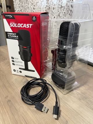 Micrófono HyperX Solocast en color negro. Compacto y flexible, ideal para streaming o gaming. - Sensor táctil para silenciar. - Patrón polar cardioide. - Plug N Play para fácil conexión. - Incluye soporte.