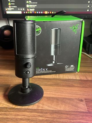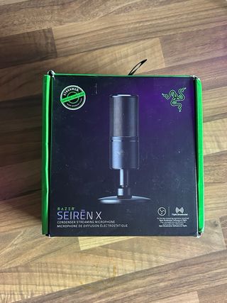 Micrófono de condensador Razer Seiren X en color negro. Diseñado para streaming y podcasts. - Patrón polar supercardioide para reducir el ruido de fondo. - Soporte integrado para un posicionamiento óptimo. - Puerto de salida de auriculares de 3.5mm para monitorización sin latencia.