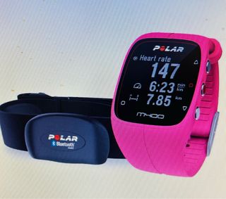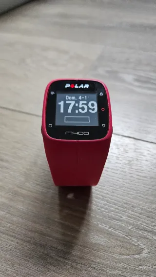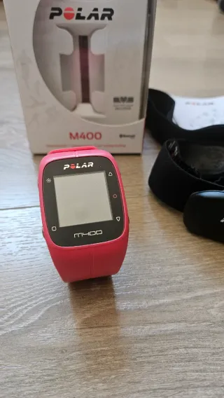 Reloj deportivo Polar M400 en color rosa, ideal para el seguimiento de actividades. Tiene sus años pero funciona correctamente. - Incluye cinta deportiva H7, banda SoftStrap - Diseño moderno y funcional.