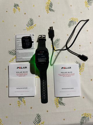 Reloj deportivo Polar M430 en color negro, ideal para entrenamiento y seguimiento de actividad física. Incluye banda pectoral Polar H7 para una medición precisa del ritmo cardíaco. - Reloj GPS Polar M430. - Banda pectoral Polar H7 con Bluetooth. Lo dejé de usar porque perdí el cargador, por eso no lo incluyo. Se puede comprar por 7€.