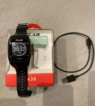 Reloj deportivo Polar M430 en color negro. Se incluye la caja y el cargador originales. - Incluye caja original. - Incluye cargador original. La correa no es la original, se cambió hace años. Siempre con protector de pantalla, excelente reloj del que aún venden recambio y complementos. Funciona con la app polar flow. A mí no me deja poner el menú en castellano pero es lo de menos. Me han regalado Garmin 255 y después de unos años con el lo tengo que vender