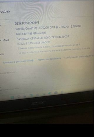 El precio mostrado es el de venta en nuestra tienda. El precio de este producto en nuestra página web puede ser diferente. Este artículo está disponible en nuestra tienda de Cartagena. pc portatil acer acer CC063_E715848_0 es un objeto que se ofrece en estado muy bueno. Todos nuestros productos cuentan con garantía de 3 años y un plazo de devolución de 14 días. Pantalla tactil: No | Tecnologia almacenamiento: Hdd | Capacidad ssd: 0 | Idioma teclado: Español | Marca: Acer | Modelo: Acer | Pulgadas: 15.6 | Tipo: Clásico | Procesador: Intel core i3-7020u processor | Memoria ram: 4 | Capacidad hdd: 120 | Tarjeta grafica: Compar