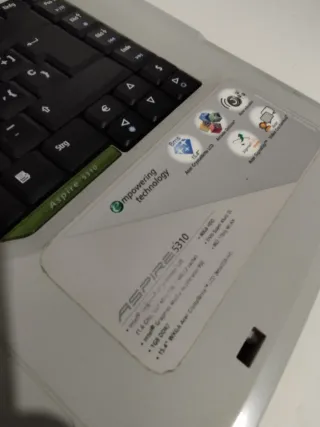 Portátil Acer Aspire 5310 con pantalla de 15.4. - Procesador Intel (1.6 GHz, 512 KB L2 cache) - 2 GB DDR2 RAM - Tarjeta gráfica Intel Graphics Media Accelerator 950 - Disco duro de 160 GB - Unidad DVD Super Multi - Conectividad WLAN 802.11b/g - Sistema operativo actual Windows 10 Pro, activado - Funciona todo perfectamente, ninguna tecla dañada, todo correcto y operativo, se entrega con cargador compatible, la batería dura 30 minutos aproximadamente, de ahí su precio.