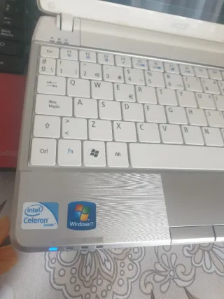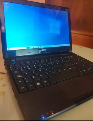 💻 Acer Aspire One Portátil compacto de 10.1' Windows 10 Procesador Intel Atom N450, 1.66 GHz Batería con 6 celdas Memoria RAM 1Gb Disco Duro de 250Gb Pantalla LCD Gráficos Intel GMA 3150 Altavoces duales estéreos, micrófono y cámara web Puertos: 3 USB VGA, Red, etc. Cargador original incluido Peso ligero (aprox. 1.25 Kg) ⚠️ ORDENADOR ADECUADO PARA REALIZAR FUNCIONES BÁSICAS . No cierra perfectamente, pero no afecta a su funcionalidad (última foto). .🔋La batería no dura mucho tiempo, pero se puede utilizar enchufado a la corriente 🔌.