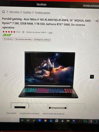 Portátil gaming Acer Nitro V 16S con pantalla de 16 WQXGA. - Procesador AMD Ryzen™ 7 260. - 32GB de RAM. - Almacenamiento SSD de 1TB. - Tarjeta gráfica GeForce RTX™ 5060. - Windows 11 Home con licencia - Tiene factura y por lo tanto garantia. Se compró a finales de septiembre del año pasado, y no se ha utilizado apenas. - Personas serias. No hago cambios
