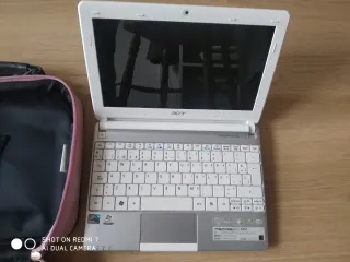 Portátil Acer Aspire One D257 en color blanco. Compacto y ligero, ideal para llevar a todas partes. - Pantalla de 10.1 pulgadas. - Teclado QWERTY español. - Incluye cargador y maletín rosa.