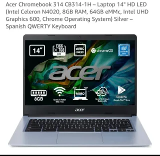 Laptop Acer Chromebook 314 en color plata. Ideal para tareas diarias y navegación web, está usado pero en muy buenas condiciones. - Pantalla HD LED de 14 pulgadas. - Procesador Intel Celeron N4020. - 8GB de RAM. - Almacenamiento eMMC de 64GB. - Gráficos Intel UHD Graphics 600. - Sistema Operativo Chrome OS. - Teclado español QWERTY.
