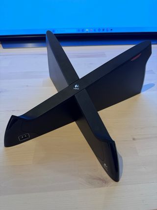 Soporte para portatil marca logitech con concentrador USB. Con un puerto frontal y 3 en la parte de detras. Tiene un diseño muy cuidado en forma de X y se puede desmontar para poder transportarlo cómodamente como se puede ver en las fotos. Además ayuda a mejorar la refrigeración del ordenador portátil e incrementa la altura de la pantalla. La parte que está en contacto con el ordenador tiene acabado en goma por lo que tiene buen agarre y no daña la carcasa.