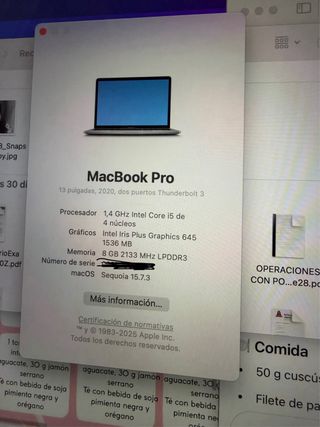 Procesador Intel Core i3 1.1 GHz de doble núcleo (dual-core), 8 GB de memoria RAM LPDDR4X 3733 MHz, memoria SSD 256 GB, gráficos Intel Iris Plus 1536 MB, teclado US, sistema operativo macOS 15.7.2 instalado y funcionando sin problemas. Pantalla Retina de 13 pulgadas. Poco uso, con caja original y funda de regalo. Se entrega formateado y listo para usar. Lo vendo por cambio de equipo. Entrega en mano o envío por mensajero 24h.