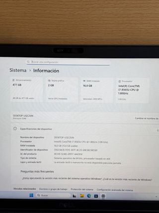 Dell Precision 3540 i7 + 16GB + 512Gb Funciona perfectamente y muy fluido Estado estetico en buenas condiciones Es un portatil con mucha potencia Bateria en Excelente Estado y dura mucho Se entrega con cargador original Características: Procesador: Intel Core i7-8565U 1.80GHz Ram: 16Gb RAM Disco Duro: 512Gb SSD Gráfica: AMD Radeon Pro WX 2100 2Gb GDDR5 Pantalla FULL HD de 15,6 Pulgadas Modelo: Presicion 3540 Teclado Español con retroiluminacion Windows 11 Pro