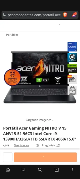 Quiero vender mi ordenador portátil Acer. Está en perfecto estado y tiene un diseño elegante. Ordenador portátil Acer nitro, con un procesador Intel i5 para gaming, 16GB de memoria RAM, tarjeta gráfica NVIDIA RTX 3060, un terabyte de almacenamiento, resolución de pantalla de 144 hz, con sistema operativo Windows 11, 3 puertos USB, HDMI en la parte de atrás junto con el cargador, hecho para que se pueda cargar hacia ambos lados y conector USB-C, teclado RGB ajustable, ventiladores programables y sonido con Nvidia Broadcast y Dts ultra. Incluye el cargador.