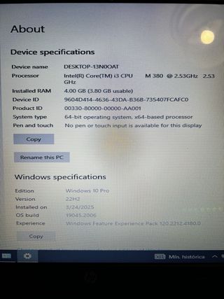 Ordenador portátil HP con procesador Intel Core i3. - Procesador: Intel(R) Core(TM) i3-N305 (1.80 GHz) - RAM: 8,00 GB (7,66 GB usable) - Sistema operativo: Windows 11 Home - Versión: 25H2 - Instalado el: 17/12/2024