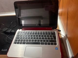 vendo ordenador portátil HP en color rojo, de 4 gb de RAM, 446 gb de almacenamiento, de 11 pulgadas de pantalla, con cargador, la pantalla es táctil, y el portátil se puede doblar como si fuera una tablet