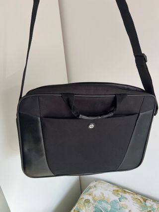 Funda negra para portátil HP, con asa y correa. - Material textil resistente. - Detalles en polipiel. - Logo de HP visible. Sin usar