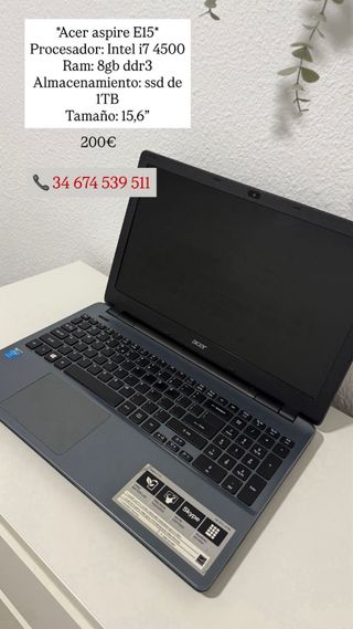 Portátil Acer Aspire E15 en buen estado. - Procesador: Intel i7 4500 - Memoria RAM: 8GB DDR3 - Almacenamiento: SSD de 1TB - Tamaño de pantalla: 15,6 - Precio: 200€ - Contacto: 34 674 539 511