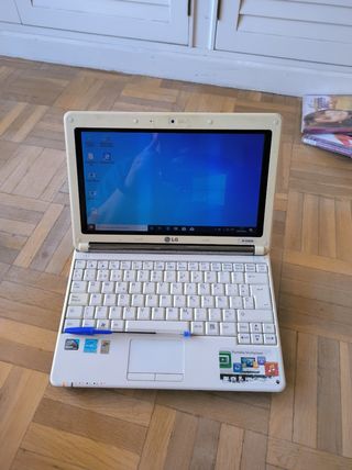 Notebook LG comprado a la UCLM. En su caja original de compra, se entrega el notebook, el cargador original (creo que ya no funciona), un cargador universal, la batería del notebook y una funda de transporte. 10" de pantalla. Lo que se ve en las imágenes.