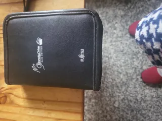Disco duro externo portátil con conexión USB. Incluye funda protectora y cables. - Diseño compacto y ligero. - Funda de cuero sintético negro. - Compartimentos interiores para cables y accesorios.