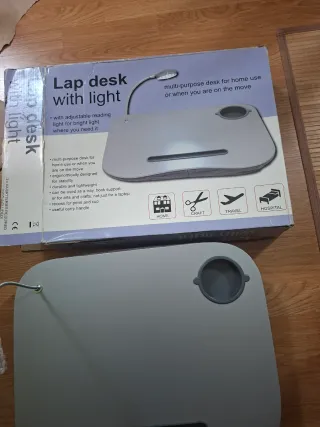 Almohadilla multiusos para portátil con luz LED integrada. Ideal para usar en casa o mientras viajas. - Luz de lectura ajustable. - Diseño ergonómico para mayor estabilidad. - Ligera y duradera. - Receso para bolígrafos y taza. - Asa de transporte. - Apta para manualidades, como bandeja o soporte de libros.