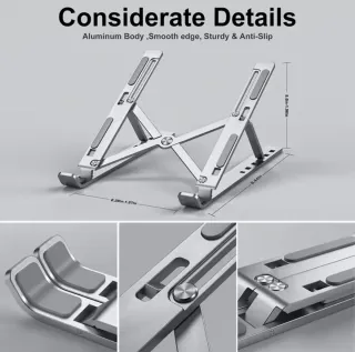 Soporte plegable para portátil iPSDI, completamente nuevo y sin usar. Fabricado en aluminio resistente y con superficies antideslizantes para mantener el portátil firme. Medidas aproximadas: 24,5 cm de ancho entre patas y 20 cm de altura cuando está abierto. Ajustable en varias posiciones para mejorar la postura y la ventilación. Compatible con portátiles hasta 17 pulgadas. Muy ligero y portátil gracias a su diseño plegable. Incluye funda de transporte. Visita mi perfil, tenemos muchos más productos.