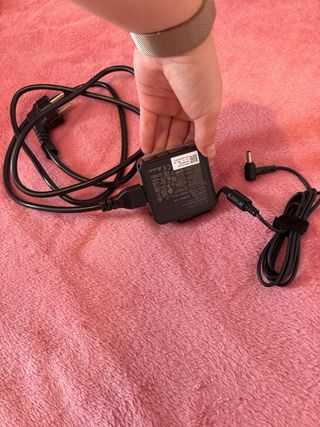 Adaptador de corriente para portátil. - Cable de alimentación con enchufe europeo. - Transformador cuadrado negro. - Conector de salida en ángulo recto. No lo he usado nunca