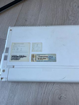 Mini portátil Packard Bell en color gris y blanco. Un dispositivo compacto y ligero, ideal para tareas básicas. - NO SE ENCIENDE, no dispongo de cargador y no se si funciona, por fuera está en muy buenas condiciones. - Pantalla de 10 pulgadas. - Teclado QWERTY español. - Procesador Intel Atom. - Diseño elegante y funcional. - Funda incluida.