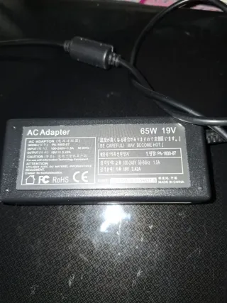 Cargador de corriente para Packard Bell de 65W y 19V. - Incluye cable de alimentación. - Etiqueta de advertencia de calor incluida. - Modelos compatibles en fotografia