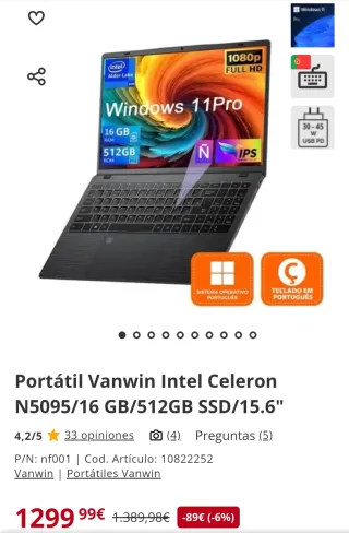 Portátil Vanwin Intel Celeron 16GB RAM 512GB SSD/