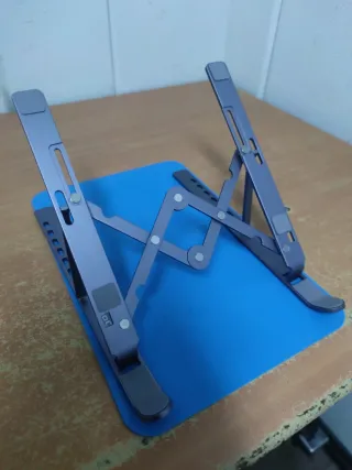 Soporte de aluminio para elevar tu portátil en la mesa. Su diseño ergonómico ayuda a mejorar la postura. - Fabricado en aluminio. - Color gris. - Diseño plegable y portátil. - Nuevo sin estrenar.