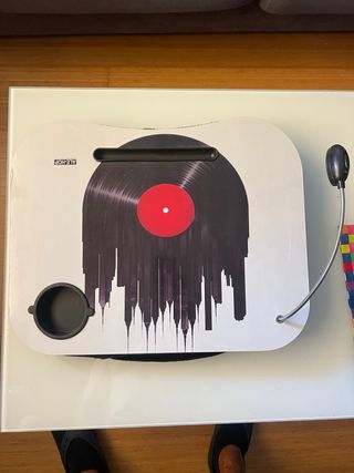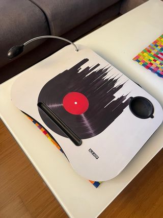 Mesa para ordenador portátil, ideal para usar en el sofá o cama. Tiene un diseño moderno con una ilustración de vinilo y el skyline de Nueva York. - Incluye un posavasos. - Dispone de una ranura para bolígrafos o lápices. - Dispone de flexo led que funciona con pilas. - Se encuentra en buen estado.