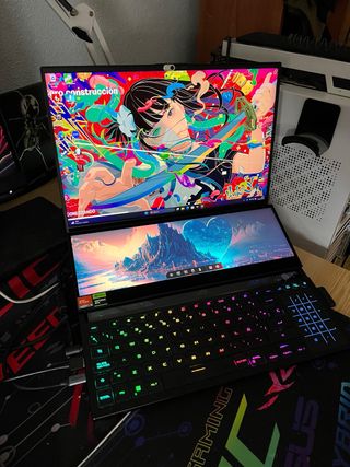 Portátil ASUS ROG Zephyrus Duo 16 GX650PY LEER DESCRIPCIÓN ¡Muy bien cuidado, absurdamente potente! Modelo con RTX 4090 175w Ryzen 9 7945HX Pantalla principal WQHD 2560x1600 a 240Hz Mini LED Pantalla secundaria 4K RAM 64BG DDR5 4 TB SSD M.2 en RAID 0 Sólo un detalle, el trackpad a veces se bugea. Hablé con Asus, se soluciona temporalmente. No afecta al funcionamiento. La segunda pantalla se puede convertir en mouse pad fácilmente. Aún así, por esto, regalo un ratón gaming ROG Gladius III Pregunta sin compromiso. Escucho ofertas.