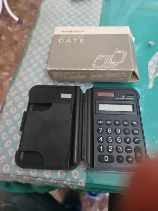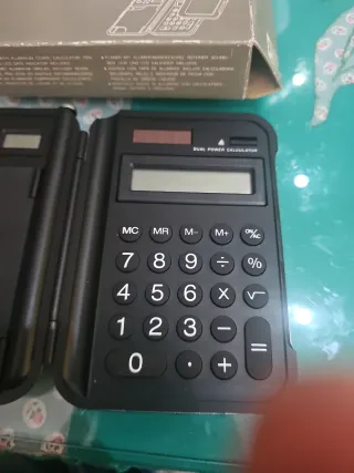 Calculadora digital compacta y portátil con diseño plegable. Incluye funda protectora. En muy buen estado. - Pantalla LCD. - Alimentación dual (solar y batería). - Teclado numérico completo.