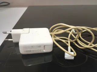 Adaptador de corriente blanco para ordenador Mac. - Conector MagSafe. - Cable de carga incluido. - Enchufe europeo.
