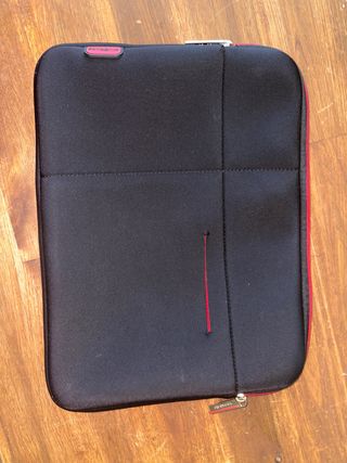 Funda para portátil de la marca Samsonite. Es de color negro y tiene un diseño moderno. - Cremallera roja. - Detalle de costura roja vertical. -interior acolchado anti golpes