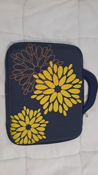 Funda para ordenador portátil con un diseño floral. - Color azul marino. - Estampado de flores amarillas y naranjas. - Asa de transporte incorporada.
