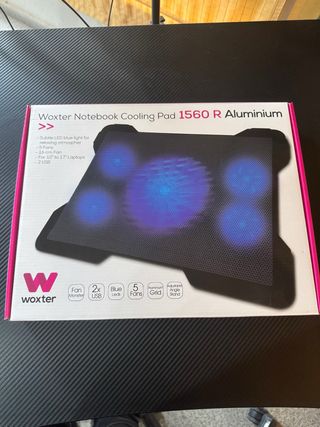 Base refrigeradora para portátiles Woxter. - Diseño en aluminio. - Iluminación LED azul. - 5 ventiladores. - Rejilla de aluminio. - Soporte ajustable en ángulo. - Para portátiles de 10 a 17. - 2 puertos USB.