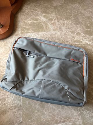 Funda o bolsa para portátil de la marca Samsonite. Diseño moderno en color gris con detalles en naranja. - Compartimento principal acolchado. - Bolsillo frontal con cremallera. - Asa de transporte. - Cierre de cremallera.