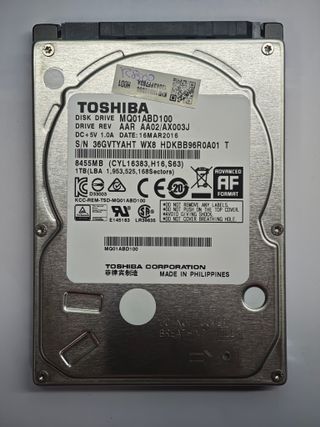 Disco duro interno de 2.5 pulgadas con capacidad de 1TB. - Modelo: MQ01ABD100 - Capacidad: 1TB - Interfaz: SATA - AAR: AA02/AX003J - HDKBB96R0A01 - Fabricado en Filipinas - Fecha de fabricación: 16 MAR 2016 Se entrega formateado, lo que significa que no contiene datos, ni windows, ni juegos, ni programas. - - PRECIO NO NEGOCIABLE - -