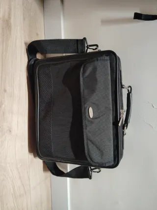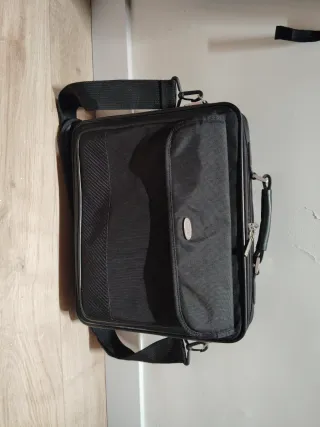 Maletín negro para portátil con un diseño moderno y funcional. Ideal para transportar tus dispositivos de forma segura. - Compartimento principal acolchado. - Bolsillo frontal con cremallera. - Correa de hombro ajustable y asa de mano. - Material resistente y duradero.