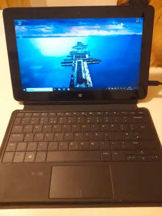 Ordenador portátil en color negro, con pantalla táctil que permite utilizarlo como tablet. Diseño compacto y ligero. Teclas adicional con disposición QWERTY. Funciona perfectamente, pero habría que cambiarle la batería, de ahí el precio.