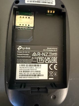 Dispositivo portátil TP-Link para conexión a internet 4G. Router WiFi portátil TP-Link 4G con batería, ideal para viajar o trabajar fuera de casa. Permite compartir internet vía SIM 4G/3G hasta en 10 dispositivos, batería de hasta 8 h, tamaño compacto. Funciona perfectamente - Diseño compacto y elegante. - Botón de encendido/apagado. - Logo de la marca visible.