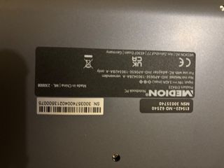 Portátil Medion modelo E15423, ideal para uso diario. - Color: Negro y gris. - Producto: E15423. - Entrada: 19V 3.42A (max). - Fabricado en China. ML-230008. - Número de serie: 30035740040213500075. - MSN: 30035740. - Requiere adaptador de corriente JHD-AP065E-190342BA-A.