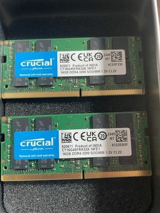 Kit de 2 módulos de memoria RAM Crucial DDR4 SODIMM. - Capacidad total: 32GB (2x16GB). - Velocidad: 3200MHz. - Latencia: CL22. - Formato: SODIMM, ideal para portátiles, mini PCs y ordenadores compactos.