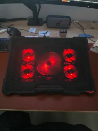 Base refrigeradora para portátil con iluminación LED en color rojo. Diseñada para mejorar la ventilación de tu equipo. - Múltiples ventiladores para una refrigeración eficiente. - Diseño en malla negra. - Soporte ajustable para el portátil. - Si se mueve fuerte tiende a desconectarse el cable