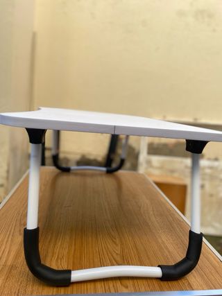Mesa portátil con patas plegables, ideal para usar en la cama o el sofá. - Superficie blanca. - Patas metálicas blancas con protectores negros.