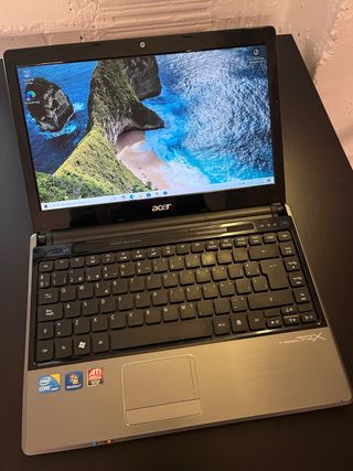 Ordenador portátil Acer Aspire 3820 TimelineX con acabado negro y plateado. Pantalla de 13,3 pulgadas. Recien formateado con la ultima version de Windows 10 Home. Bien conservado. 2 baterias extraibles (1 de ellas agotada pero que lo levanta en altura para que el equipo respire mejor) - Procesador Intel Core i3. - 4 GB de RAM. - Disco duro SSD de 250Gb. - Wifi, ethernet(RJ45), 3 x usb 2.0, lector de targetas, hdmi, vga, salida auriculares 3,5mm i entrada microfono. - 1,81 kg, y cargador original.